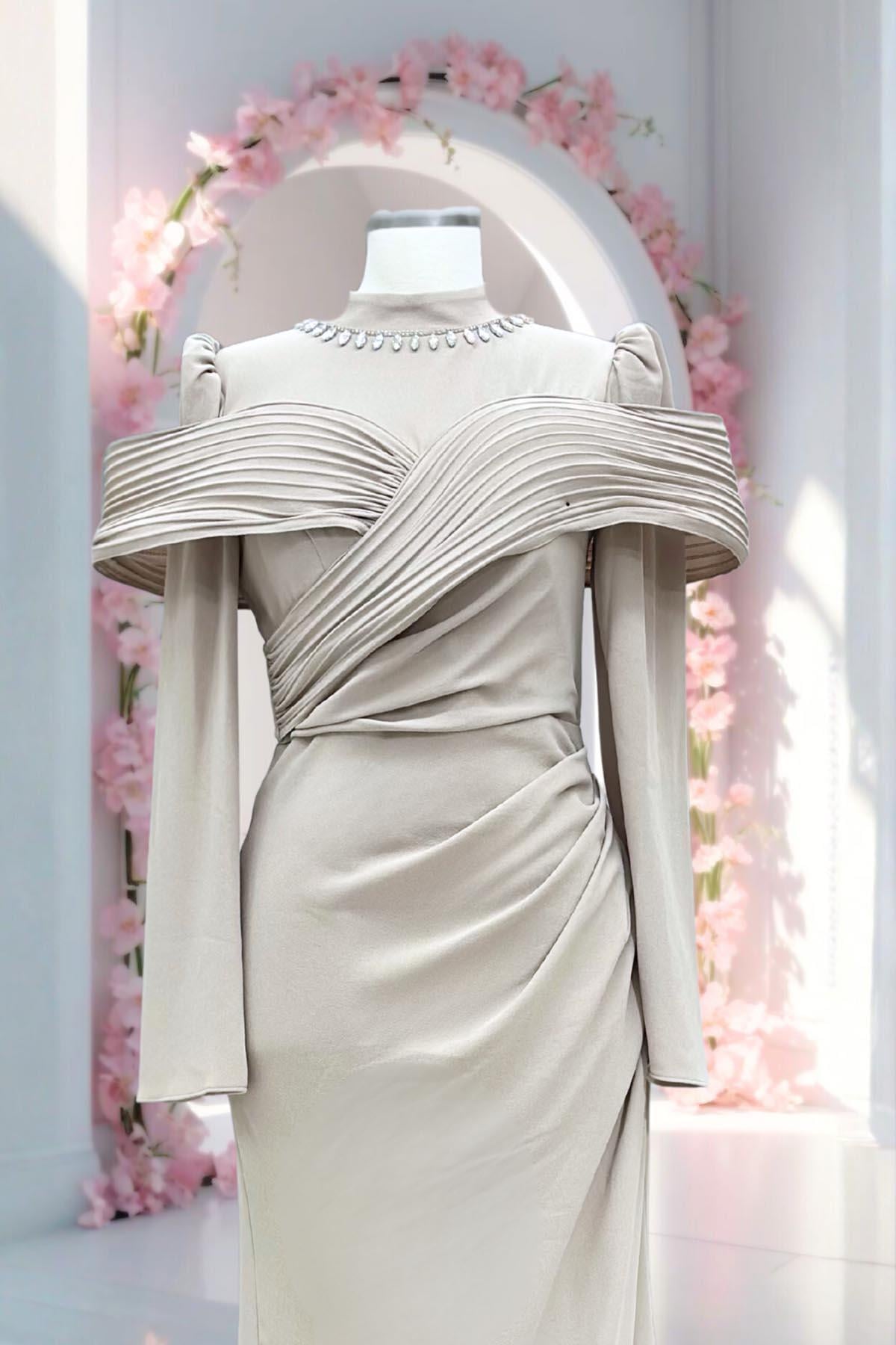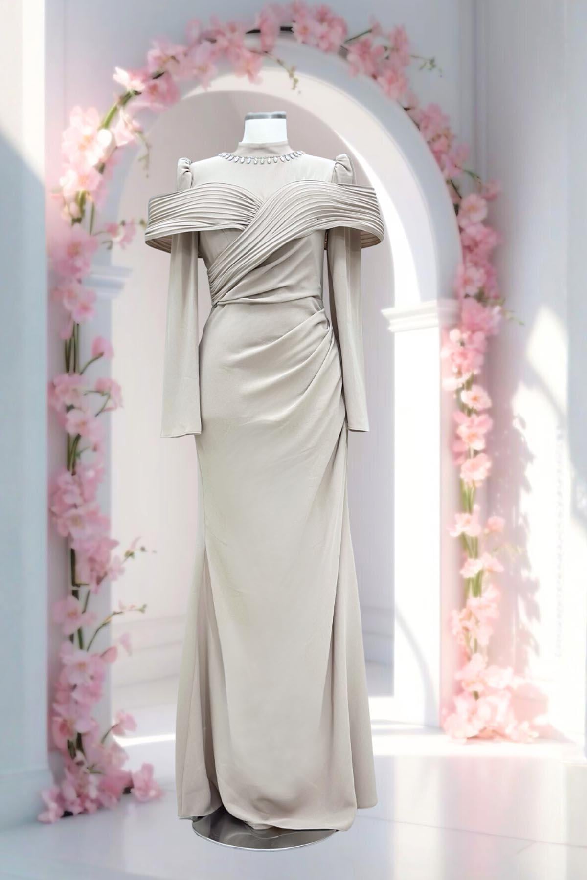 Amine Hüma Dila Abiye Elbise Bej (3664)